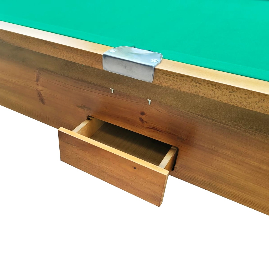 Descrição: Tampo em pedra ardósia, estrutura do caixote da mesa em madeira maciça, jogo de caçapas em courvin com redes, tabelas confeccionadas com borracha prensada em "L" (como nas mesas profissionais), tecido em acrílico, acabamento em verniz. Imagens meramente ilustrativas.