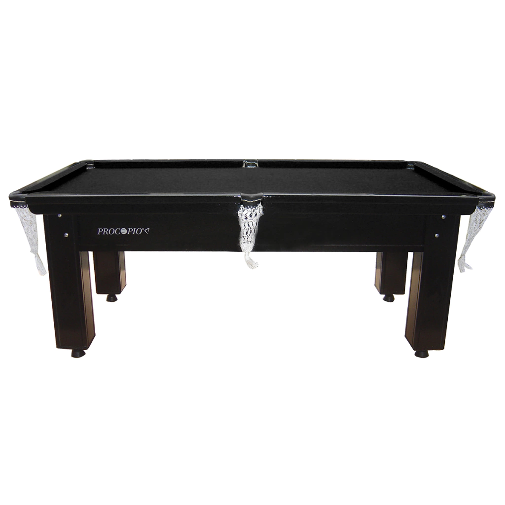 Descrição: Tampo em pedra ardósia, estrutura do caixote da mesa em madeira maciça, jogo de caçapas em courvin com redes, tabelas confeccionadas com borracha prensada em "L" (como nas mesas profissionais), tecido em acrílico, acabamento tingido em preto. Imagens meramente ilustrativas.
